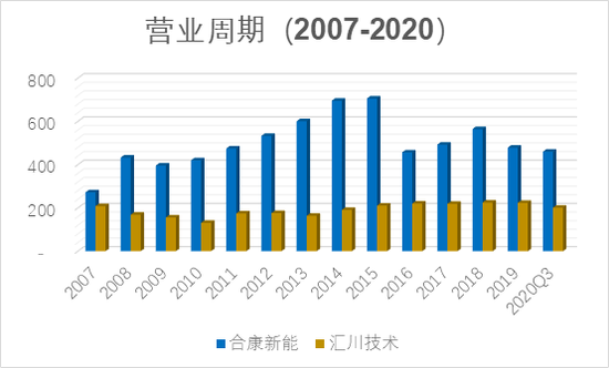 经营活动现金流(OCF)背后是企业的营运能力,直接关联着企业的营业周期(即营运能力)。通常,营业周期越长越糟糕,越短则越好。汇川技术与合康新能在营业周期上的差异早就存在,提前于业绩拐点之前。
