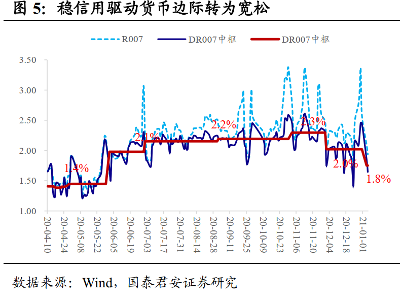 维稳信用,货币政策边际宽松。信用风险事件冲击下,2020年11~12月,信用债分别净偿还资金329亿元、2178亿元。2021年全年到期规模6.1万亿元,上半年到期占比近60%。信用事件频发导致了市场对此“一刀切”,以及全面的“防风险”,因此资质有瑕疵的个券被大量“打折甩卖”。而二级成交环境差,也会反过来阻碍相关主体的一级发行。虽然打破刚兑、重塑信用估值环境并不是货币政策“单打独斗”能够实现,但债市直接融资功能受损,一定程度上可以通过流动性“加持”予以修复。