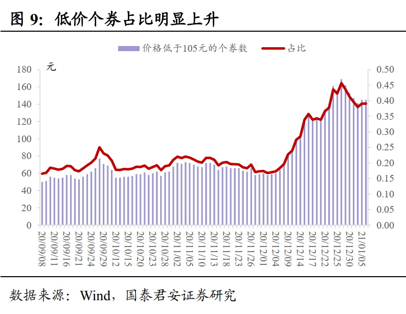 ③12月14日,“20鸿达兴业SCP001”发生实质性违约。次日,鸿达转债暴跌22%。其后,鸿达的影响有所扩散,导致低价转债进一步走弱,价格低于105元的转债占比显著上升,此外部分弱资质的转债上市即破面。