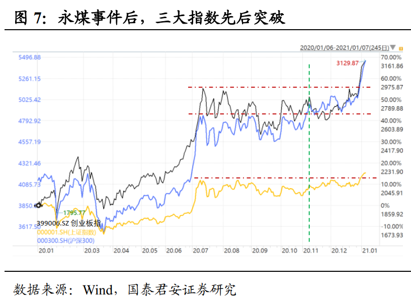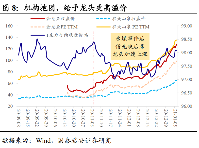 股指先后突破,股市抱团更强。在流动性加持下,中央经济工作会议要求政策“不急转弯”、中欧投资协定初步落地、美国“蓝营横扫”先后提振市场风险偏好。A股三大指数先后突破震荡区间上沿,但结构上,依旧是抱团板块强势,尚未走到“全面开花”的阶段。以消费龙头股来看,金龙鱼和农夫山泉在永煤事件冲击后加速上涨,估值也有明显提升。一般来说,强势股上涨向二三线扩散带来赚钱效应,带动指数不断上攻;本轮则表现为机构抱团更紧,最终强势板块市值暴涨权重加大,从而带动指数实现突破。