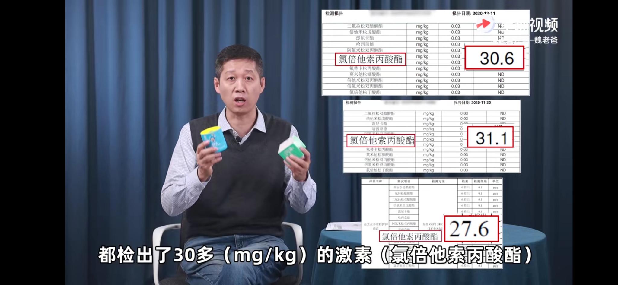 “老爸测评”博主在接到上述爆料人的投诉信息后,于2020年12月11日将福建欧艾的“抑菌霜”及其公司另一款婴儿霜“开心森林”送去检测,检测报告显示该“抑菌霜”及福建欧艾的另一款婴儿霜“开心森林”均含有超过30mg/kg的激素“氯倍他索丙酸脂”。