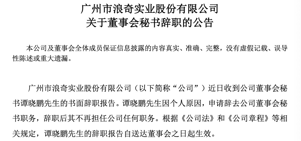 同时,广州浪奇董秘辞职不干了。公告显示,董事会秘书谭晓鹏因个人原因,申请辞去公司董事会秘书职务,辞职后其不再担任公司任何职务。