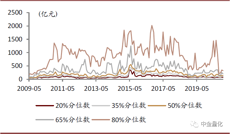 价值股优选策略持仓略偏大盘。如下图所示,统计了各期持仓的市值分布情况。从具体数据来看,2014年以来,策略持仓市值的35%分位数大多在100亿人民币以上;80%分位数很多期也可达1000亿人民币以上。