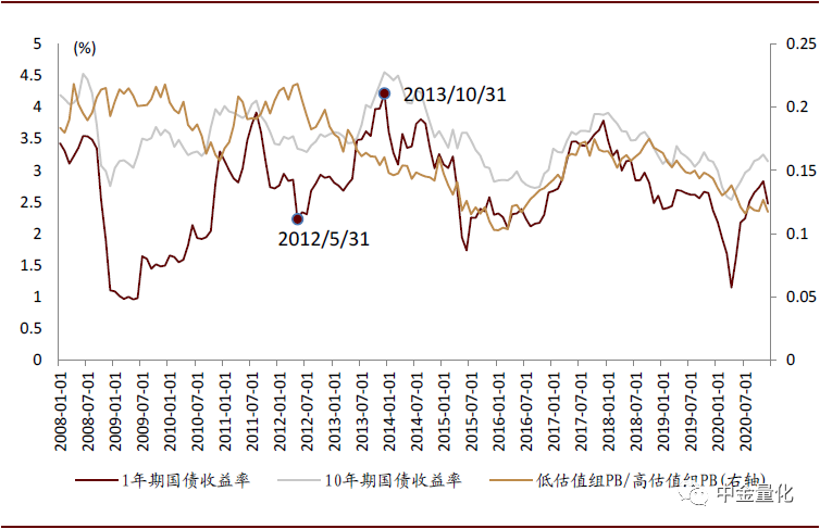 投资者的估值偏好受利率水平影响。对比国债收益率与投资者的估值偏好,不难看出,历史上大部分时间段内,投资者的估值偏好与利率水平具有显著相关关系,即:利率下行时,投资者具有相对较高的风险偏好,偏向于高估值企业;而利率上行时,风险偏好较低,投资者偏向于低估值企业。仅2012年6月至2013年10月期间,投资者的估值偏好与利率水平的相关关系出现背离,主要是受该段时间并购重组“浪潮”的影响。