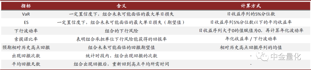其中,VaR、ES主要衡量组合的尾部风险,即出现风险事件时,可能造成多大损失;下行波动率、索提诺比率是波动率和夏普比率的改进,因为收益率为正的波动通常是有利的波动,不应纳入风险计量范围;预期相对高点回撤、出现回撤次数、平均回撤天数则统计历史上组合发生回撤的次数、幅度和时长,直观展示组合的抗风险能力。