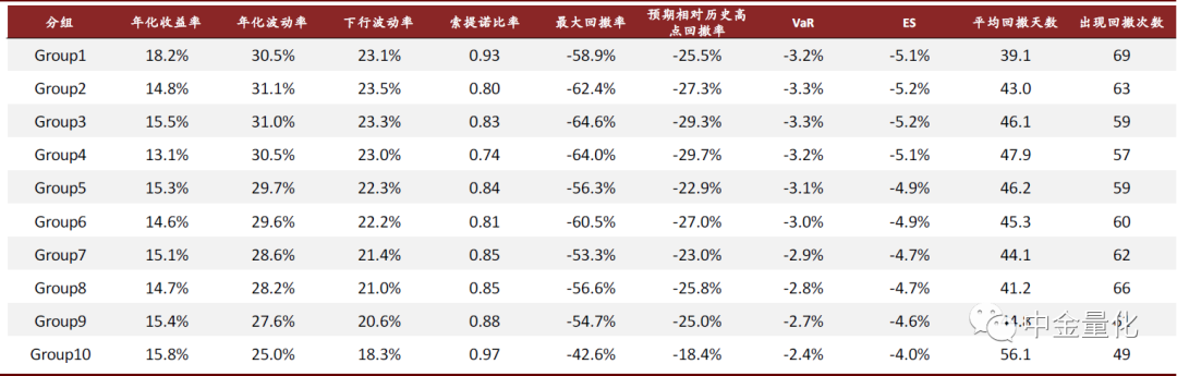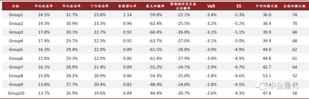 龙头得分越高的组合,风险抵御能力较强。从分组风险指标统计情况来看,龙头指标得分高的组合,下行波动率、尾部风险(VaR、ES)、回撤表现均优于龙头指标得分低的组合,呈现出明显的单调性。