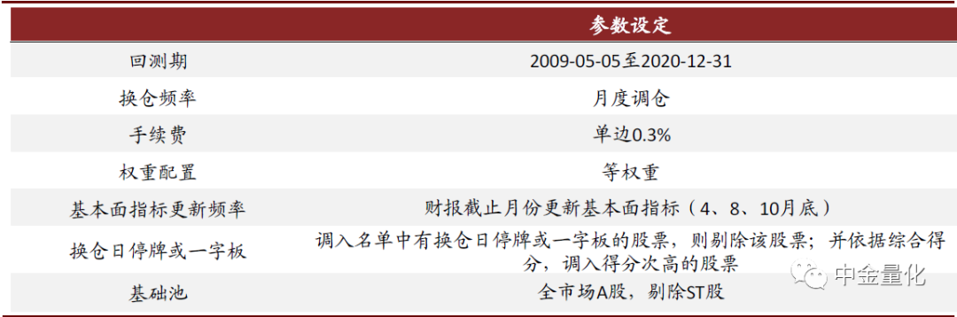 我们在如下回测框架下,对价值股优选策略历史表现进行测试,其中,回测期为2009年5月5日开始,主要是因为稳健成长指标的计算用到了多个报告期的数据,只能从2009年5月才有第一期持仓名单。