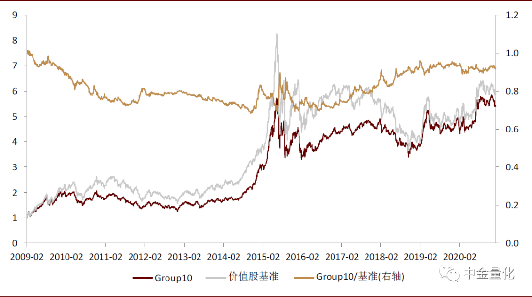 图表:平均股息率最高一组(Group10)相对价值股基础池的收益表现