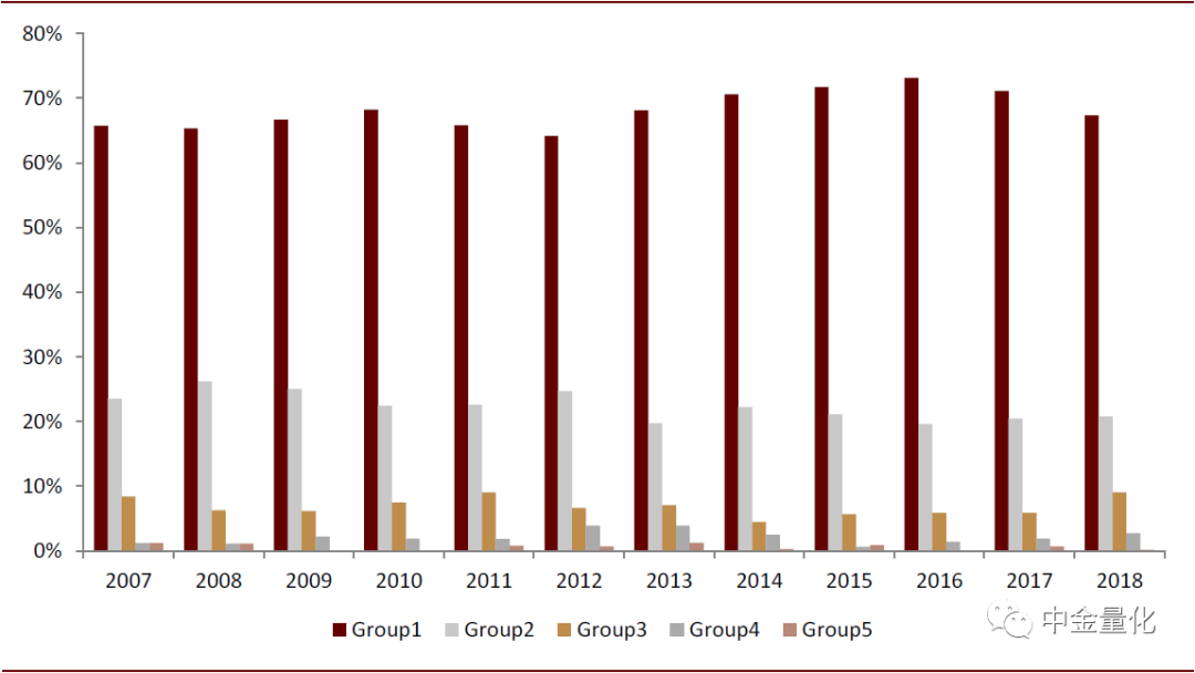 我们依据PB-ROE因子在行业中性情况下,将全市场股票均分为5组,统计了历年PB-ROE因子最低一组的股票,下一年度在各组的概率分布。