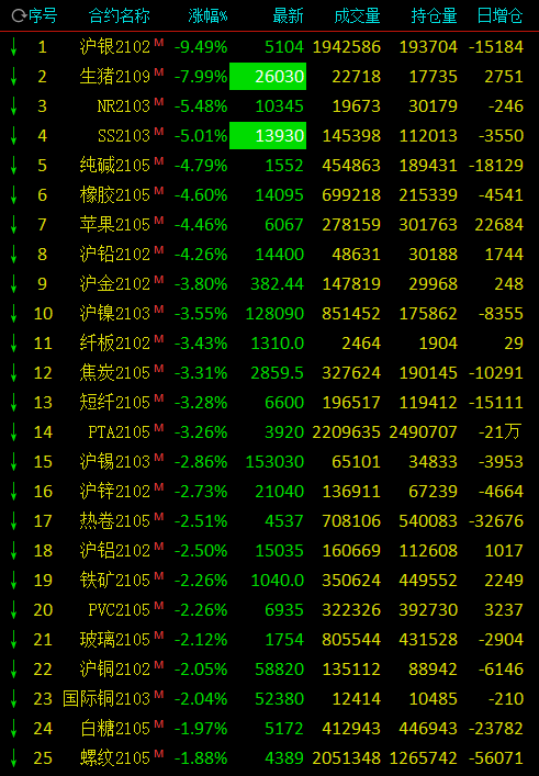 热点栏目1月11日,国内期市早盘多数品种下跌,工业品重挫,沪银跌逾9%,生猪跌停,不锈钢跌停,纯碱、橡胶、苹果、沪铅跌逾4%,沪镍、焦炭、短纤、PTA跌逾3%;农产品飘红,豆二涨逾7%,菜粕涨逾3%,豆粕涨近3%。