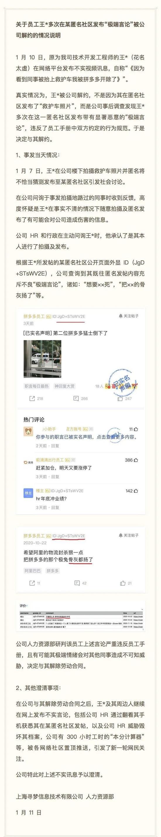 紧接着,拼多多在今日上午发布回应称,辞退王太虚并非因为他发布的救护车照片,而是因为公司查询到其既往匿名发帖内容充斥不良“极端言论”。