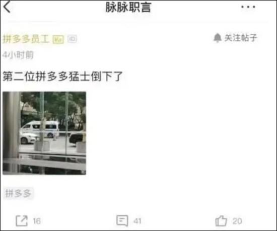 因在脉脉上发布拼多多员工被救护车拉的照片,并配字“第二位拼多多猛士倒下了。”拼多多员工王太虚遭到公司辞退,并通过微博、B站等社交媒体账户讲述了事件全过程。