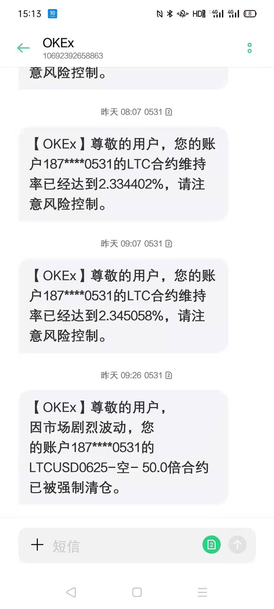 1月11日,莱特币暴跌,最低跌至124.50美元后反弹,现报138.6550美元,日内跌幅仍接近20%。有读者提供的短信截图显示,其在OKEx数字交易所的50倍杠杆莱特币合约已被强制清仓。