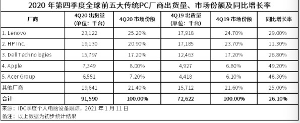 1月11日,根据国际数据公司(IDC)全球季度个人计算设备追踪报告的初步结果显示,2020年全年, 全球PC市场出货量超3亿台,同比增长13.1%,创下近年来新高。其中,2020年第四季度全球PC出货量同比增长26.1%,达到9160万台。