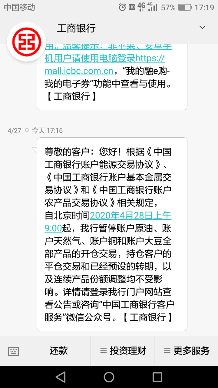 2020年4月27日,工行官网公告,自北京时间2020年4月28日上午9:00起,工行暂停账户原油、账户天然气、账户铜和账户大豆全部产品的开仓交易,持仓客户的平仓交易和已经预设的转期,以及连续产品份额调整均不受影响。