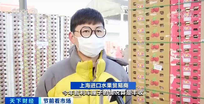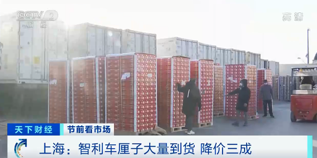 在上海的一个大型进口水果批发市场,虽然天气很冷,但记者看到,一早上就有很多来自全国各地的采购商过来进货。整个市场内,停靠着200多个集装箱货柜,它们装满了来自智利的车厘子,而随着海运船只的集中到港,车厘子的价格也比上个月有明显下降。