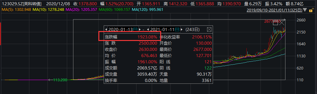 英科转债也大涨15.5%,报收2630元,上市至今暴涨2600%。从2020年1月11日至今,英科转债上涨了1923%。