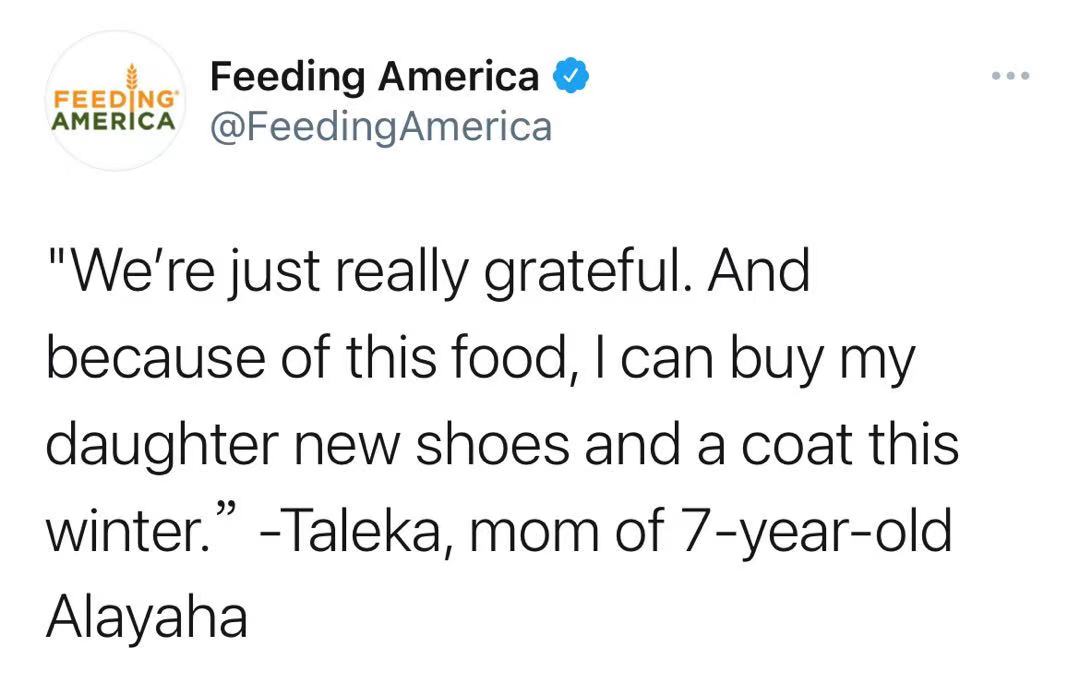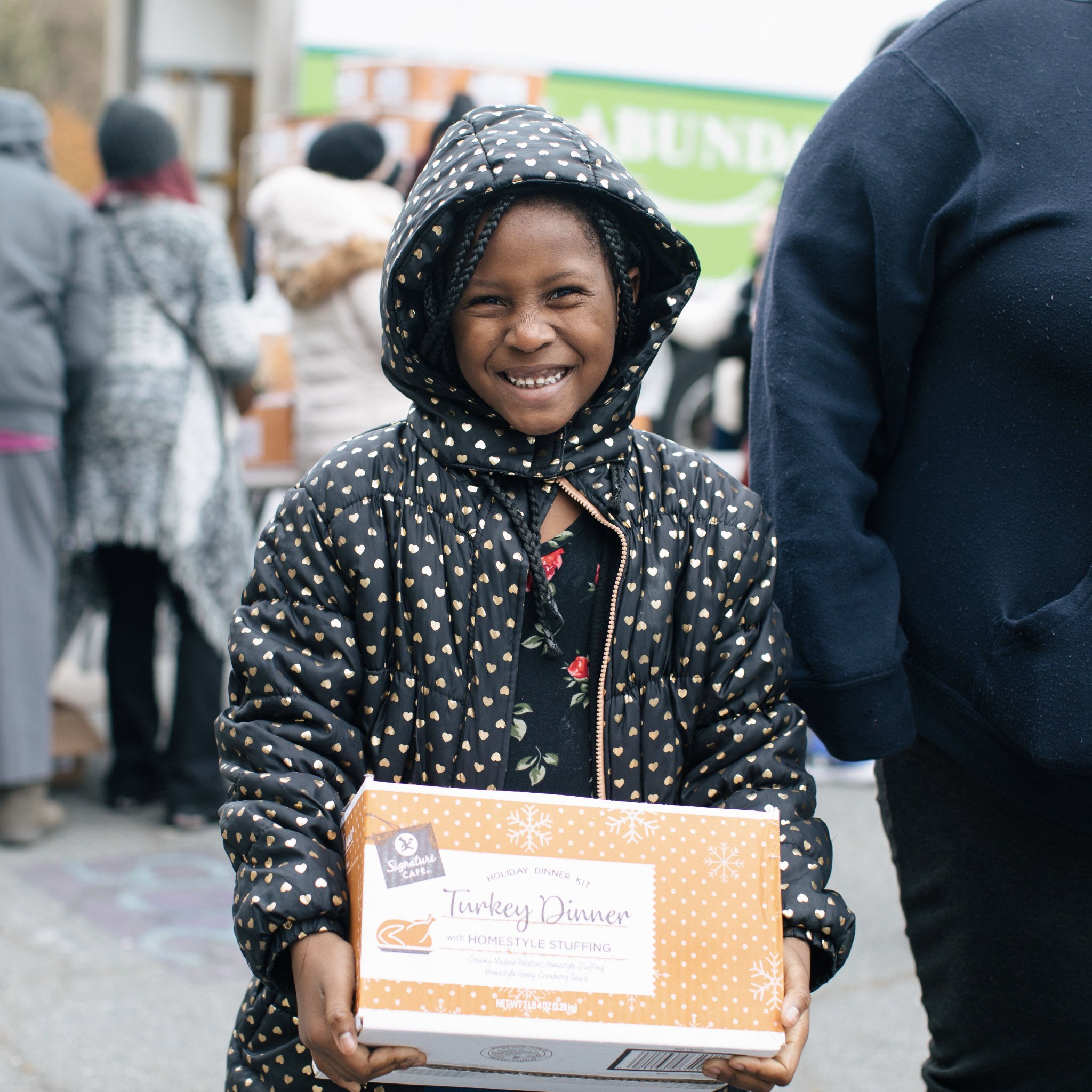 近日,“喂养美国” (Feeding America)在其社交媒体账号上,发布了一张照片:一位7岁的小女孩阿拉亚哈手捧一盒节日火鸡套餐,对着镜头笑了。