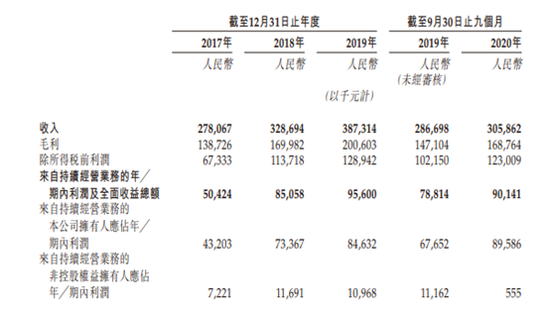 截至2017年、2018年及2019年12月31日止年度以及截至2019年及2020年9月30日止九个月,公司持续经营业务的收入分别为2.78亿元(人民币/单位下同)、3.28亿元、3.87亿元、2.87亿元及3.06亿元,持续经营业务的年内利润及全面收入总额则分别为5040万元、8510万元、9560万元、7880万元及9010万元。