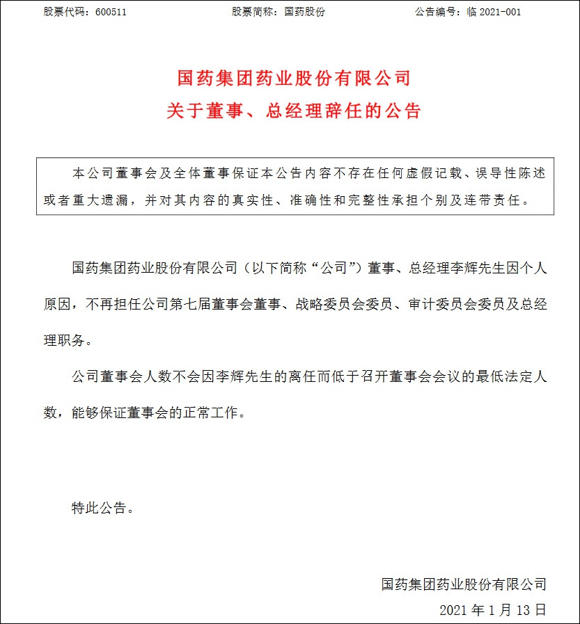 而国药股份也于当晚在上交所发布公告,公司董事、总经理李辉先生因个人原因,不再担任公司第七届董事会董事、战略委员会委员、审计委员会委员及总经理职务。