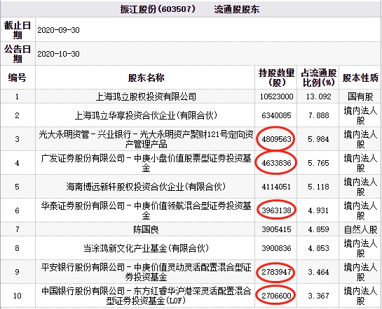 中庚基金旗下3只基金分别位列振江股份的第四、第六、第九大流通股股东,其中,广发证券股份有限公司-中庚小盘价值股票型证券投资基金持股数量为463.38万股,占流通股比例为5.765%;华泰证券股份有限公司-中庚价值领航混合型证券投资基金持股数量为396.31万股,占流通股比例为4.931%;平安银行股份有限公司-中庚价值灵动灵活配置混合型证券投资基金持股数量为278.39万股,占流通股比例为3.464%。