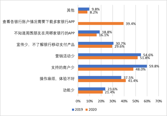 值得注意的是,《报告》称,用户认为使用手机银行客户端支付时营销活动少是最突出的问题。2020年,营销活动少和支持商户少仍然是用户使用银行客户端进行支付时存在最多的问题,分别占比51.8%和48.0%;其次操作麻烦体验不好、查看各银行情况需要下载多家银行APP和宣传少不了解银行移动支付产品的问题,分别占比41.4%、39.4%和29.6%;最后是功能少和不知道周围朋友都在用哪家银行的APP,分别是21.4%和16.1%;支持商户少问题较去年有所缓解,下降11.8个百分点。