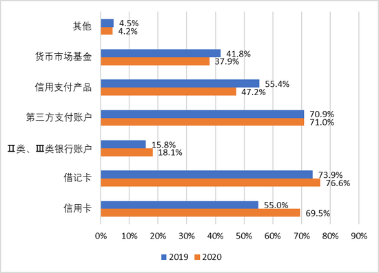 数据显示,2020年,用户最常使用借记卡进行移动支付,占比为76.6%,较2019年提高2.7个百分点;第三方支付账户(如支付宝余额、微信零钱等),占比为71.0%,与去年持平。