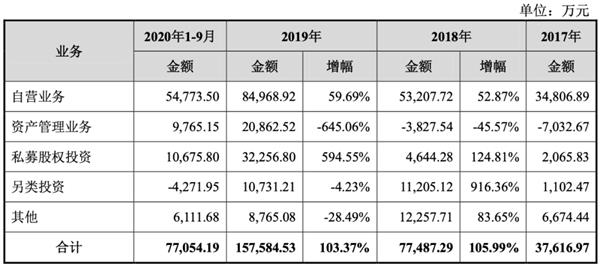 数据显示,2017年、2018年、2019年和2020年1-9月,华安证券投资与交易业务(以自营为主)分别实现营业收入1.36亿元、1.92亿元、8亿元和5.48亿元,占发行人营业收入的7.11%、10.88%、24.77%和21.52%。