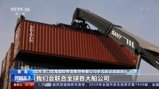山东港口陆海国际物流集团有限公司多式联运部副部长 王进:特别现在箱子比较紧缺的情况下,我们会联合全球各大船公司,尽量把这个箱子的周转期延长1~2天,然后把海运箱直接发到聊城地区,然后通过火车原箱再运到黄岛,然后直接运到码头公司在那装船。