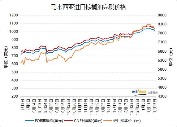 1月15日马来西亚棕榈油离岸价为1005美元,较上日跌20美元,进口到岸价为1032美元,较上日跌20美元,进口成本价为8027.23元,较上日跌155.63元。因担忧马来西亚1月出口锐减,且重要市场中国承诺进口更多印尼商品,马来西亚BMD毛棕榈油期货周四下挫5%,触及逾两周低位,棕榈油进口成本价跟盘大幅下调。