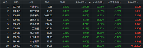 从个股来看,中国中车、东方财富、贵州茅台分别遭主力资金卖出11.00亿元、5.97亿元、5.00亿元。