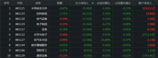 主力资金流出的板块分别是半导体及元件、饮料制造、电气设备,主力资金流出金额分别为25.96亿元、20.22亿元、17.53亿元,其中散户净流入金额为29154.11万元、10.80亿元、5.30亿元。
