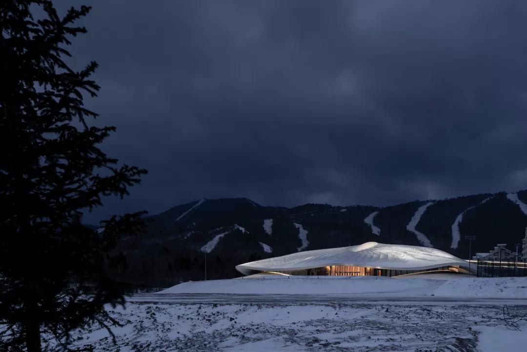 马岩松在介绍建筑设计整体理念时说:“白日,建筑犹如雪山的一部分,与其紧紧相连;夜幕降临后,灯火通明的建筑如同雪地帐篷,比喻企业家们围绕篝火,交流思想、探讨企业和创业的未来,展现了亚布力论坛创立的初心。同时它又似匍匐在大地上的翅膀,喻示生机勃勃的未来。”