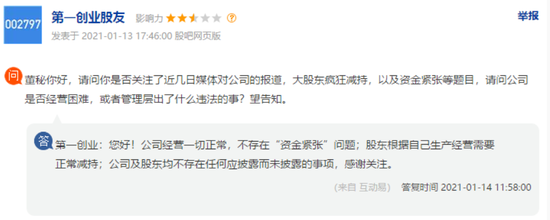 针对大股东密集减持,股价萎靡的情况,不少投资者的焦虑情绪也在上升。在东方财富股吧平台中的互动中,第一创业称“股东根据自己生产经营需要正常减持”。