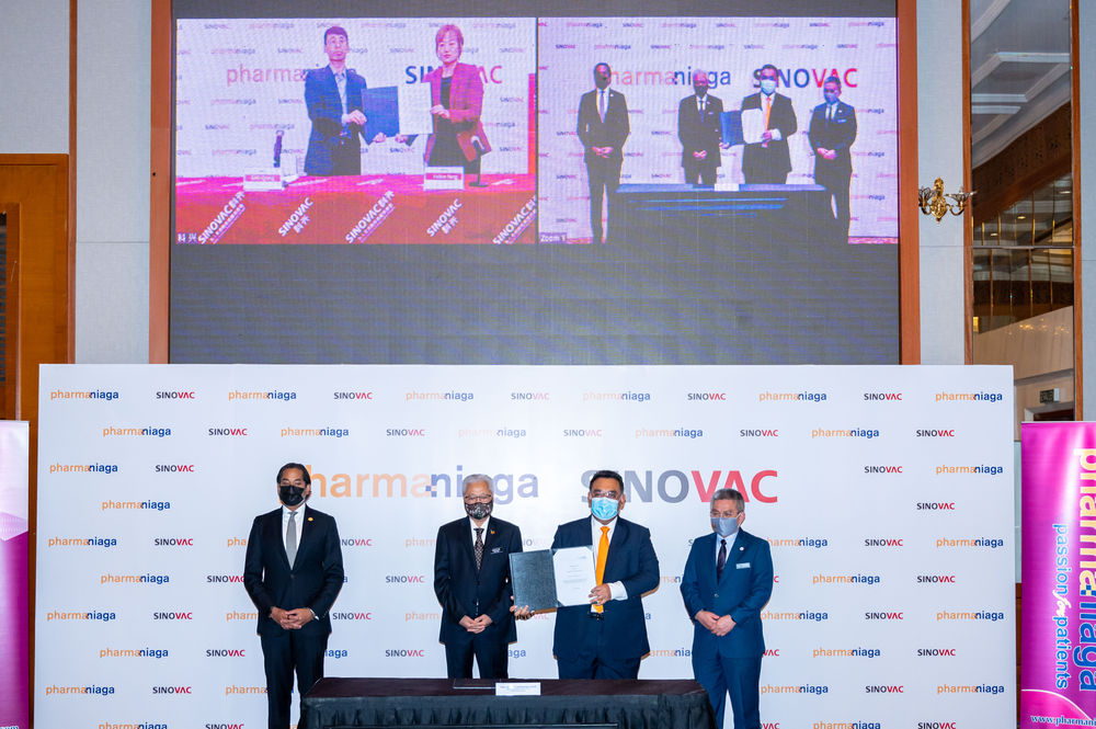 1月12日,在马来西亚吉隆坡,发马公司执行董事祖勒卡纳因(右二)展示协议文本。上方屏幕为北京科兴中维生物技术有限公司总经理高强(左)在北京展示协议文本。