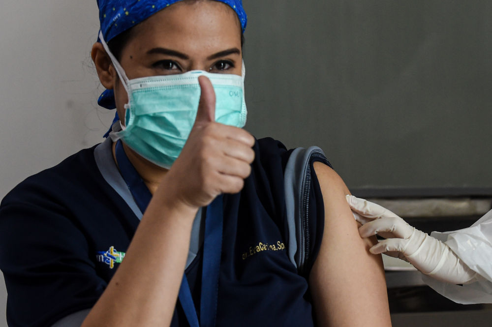 1月14日,在印度尼西亚雅加达的一家医院,一名医卫工作者接种中国科兴公司的克尔来福新冠疫苗后竖起大拇指。新华社发(阿贡摄)
