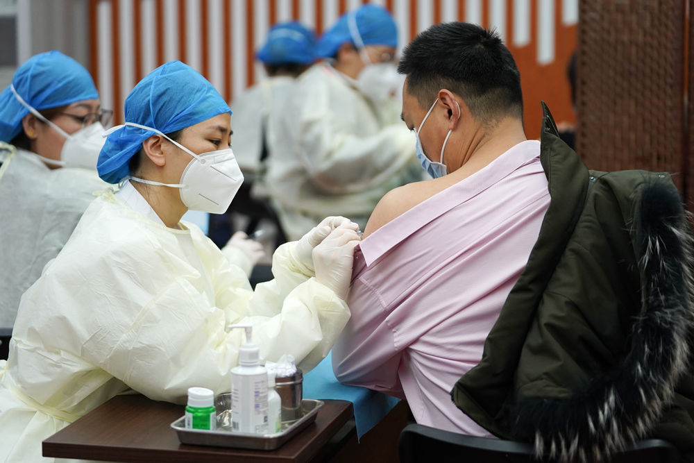 1月14日,在北京市东城区崇外街道临时接种点,来自北京市普仁医院的医护人员在为接种人员接种新冠疫苗。