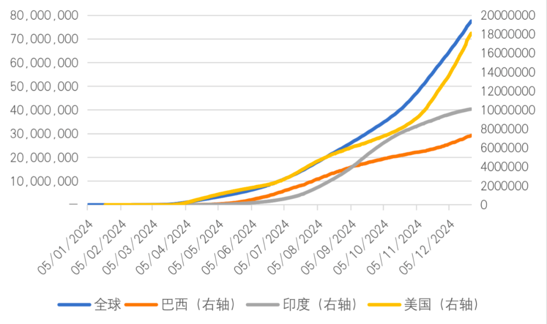 图4全球与重点国家的新冠疫情累计确诊人数