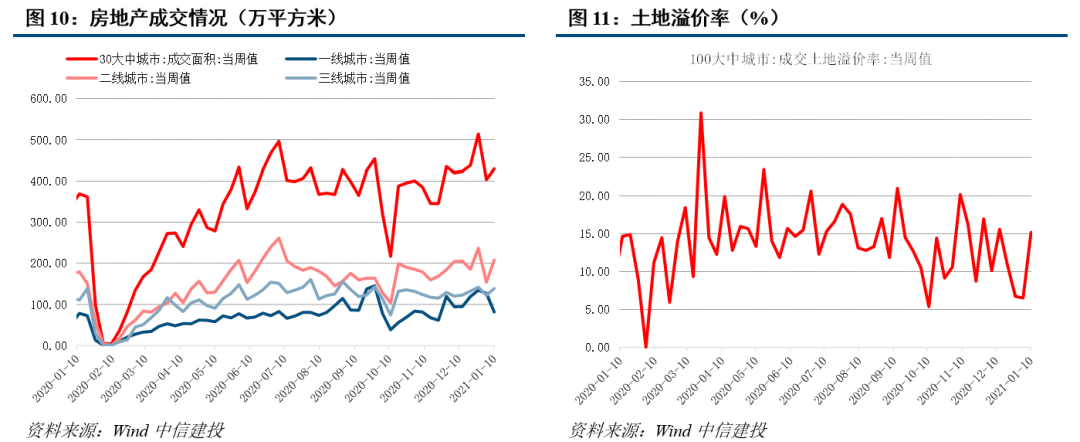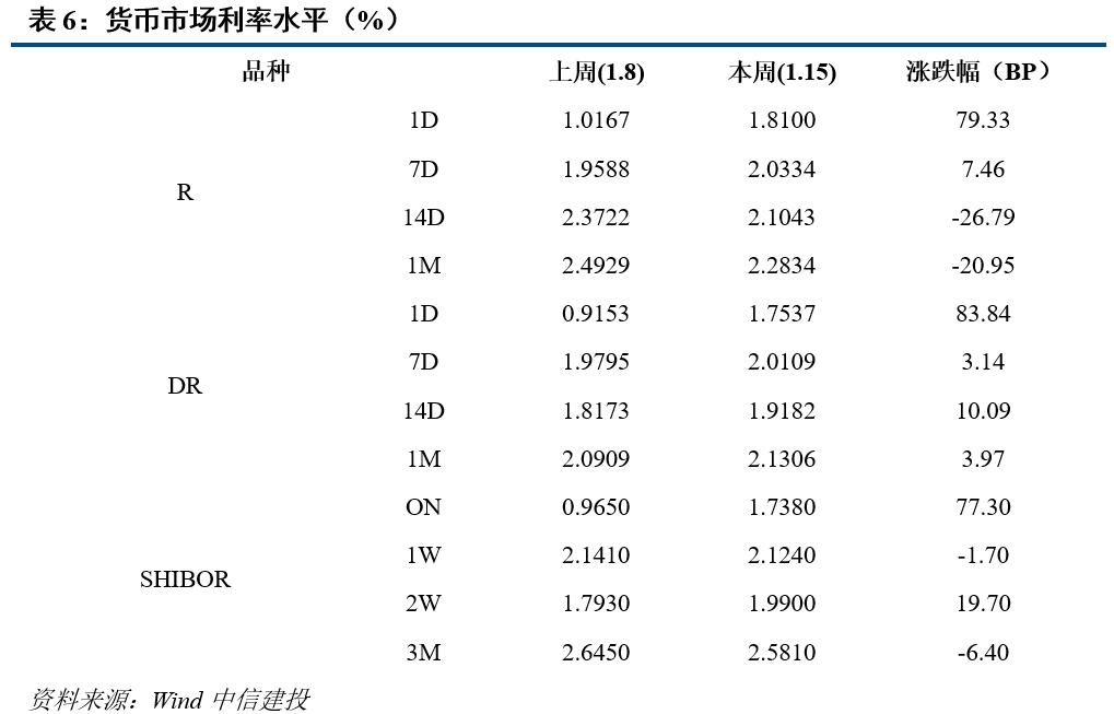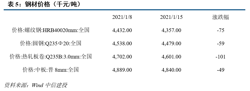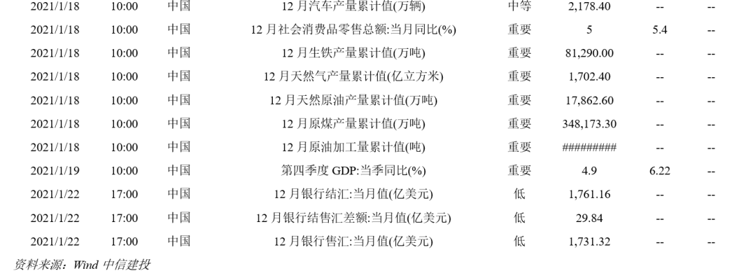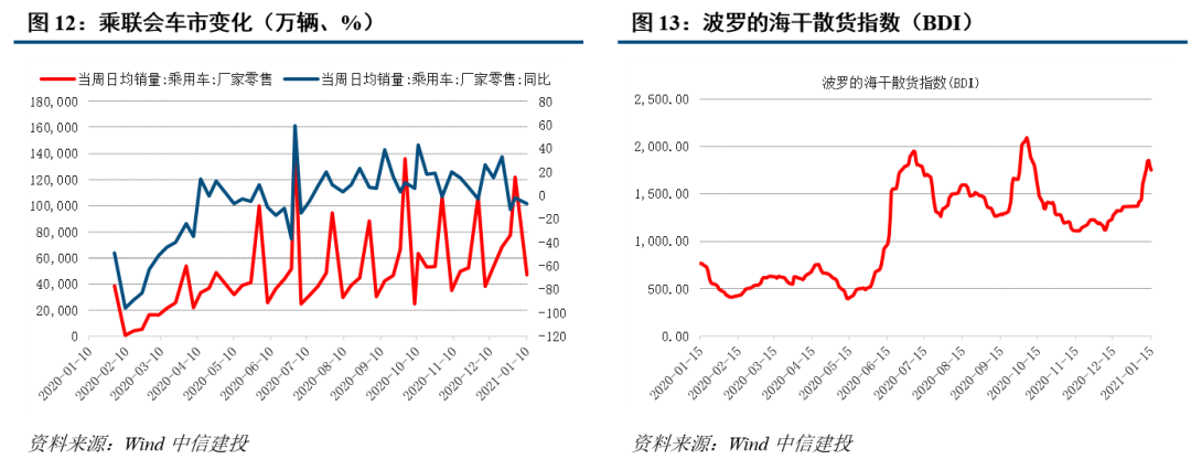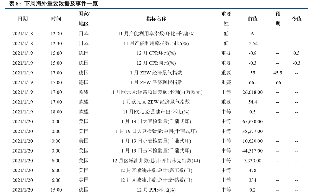 四、宏观数据方面,上游行业油价、有色金属、煤价价格涨跌不一,整体来看,上游行业价格大多呈下跌态势;中游行业价格呈下跌态势,钢材行业价格全线下跌,水泥价格较上周有所下降;下游行业土地溢价率、地产成交面积整体有所回升,车市需求表现有所转差;外贸方面,截至1月15日,波罗的海干散货指数收于1754,较上周回升148,表明全球贸易形势有所好转。
