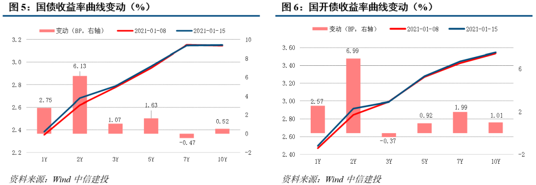 本周(2021年1月11日-1月17日,下同)国债收益曲线整体有所上移。本周债市利率变化主要受央行资金投放趋于谨慎、出口数据表现强劲等因素影响,大部分期限均有上升。具体来说:本周1年期国债收益率上行2.75BP至2.3843%,2年期国债收益率上行6.13BP至2.6810%,3年期国债收益率上行1.07BP至2.7875%,5年期国债收益率上行1.63BP至2.9634%,7年期国债收益率下行0.47 BP至3.1478%,10年期国债收益率上行0.52BP至3.1508%,10-1年期限利差缩小2.23BP至76.65BP。政策性银行债方面,10年期国开债上行1.01BP至3.5467%,10年期进出口债收益率上行0.48BP至3.6453%,10年期农发债上行1.79BP至3.6588%,政金债长端收益率整体呈现上行态势。本周净投放(含国库现金)1610亿元,其中7天逆回购净回笼390亿元,MLF净投放2000亿元,本周资金面相比上周较为宽松。其中1D期R、DR、SHIBOR利率较上周上行79.33BP、83.84BP、77.30BP,资金面近期依旧保持相对充裕状态。