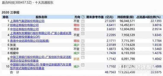 截至2020年三季度末,赢合科技共有1.63万户股东,前十大流通股东中包括招商证券、中信证券、上海浦东发展银行股份有限公司-广发小盘成长混合型证券投资基金(LOF)、香港中央结算有限公司(陆股通)、中国工商银行股份有限公司-广发创新升级灵活配置混合型证券投资基金、中国银行(维权)股份有限公司-华夏中证新能源汽车交易型开放式指数证券投资基金等机构。