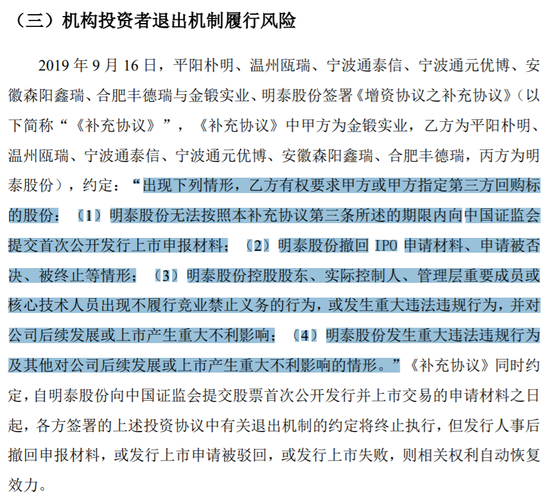 平阳朴明等在入股明泰股份时,均与明泰股份签署了《补充协议》并约定:若明泰股份撤回发行上市申请材料、发行上市申请被驳回或者发行上市失败,则存在平阳朴明等机构投资要求金锻实业回购其有的明泰股份全部股份。