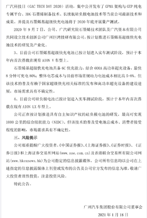 1月18日消息,广汽集团公告,石墨烯基超级快充电池与长续航硅负极电池是两种不同的电池技术。石墨烯基超级快充电池与长续航硅负极电池已按计划开展实车测试,并预计于本年内分别搭载在广汽埃安现有AION V和AION LX车型上;但石墨烯基超级快充电池的普及有赖于国家超级快充相关标准的发布和高功率超充设备的建设进展;长续航硅负极电池的普及受电池总成本、消费者接受程度的影响,市场需求具有不确定性,对公司经营业绩的影响具有不确定性。
