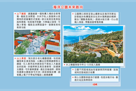 至于山上园区,部分旧设施将“退休”,以腾出空间兴建历险和健康主题区,该区可外包经营。现时园内有动物展品及小量机动游戏的核心主题区,则由海洋公园继续自行营运。