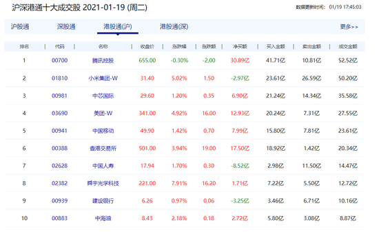 港股通(沪)来看,腾讯获得买入30.89亿,内资买入居首;港交所获得买入17.5亿,美团获买入12.93亿,中国移动、中芯国际分别获得买入7.9亿和6.9亿,小米获得卖出2.97亿港元。