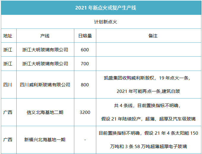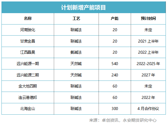 目前来看,21年甘肃金昌搬迁的20万吨纯碱装置预计2021年上半年开车运行,江西晶昊扩产20万吨纯碱装置预计2021年上半年投产。金山孟州厂区30万吨纯碱装置2020年底停车,四川广宇25万吨纯碱装置存搬迁计划,整体21年产能变动不大。2020年的产能在3265万吨,开工率82.28%,整体产量在2686万吨附件。21年的产能在3242万吨,由于20年3次幅度较大的停车检修使得纯碱开工率下滑至82%,21年预计依旧需要根据开工率来判断纯碱整体的产量。我们预计21年在浮法玻璃和光伏玻璃增量,以及海外复苏的大背景下,纯碱整体开工率有望得到一定的提升,预计开工率在84%-85%附近能维持整体供需的紧平衡。