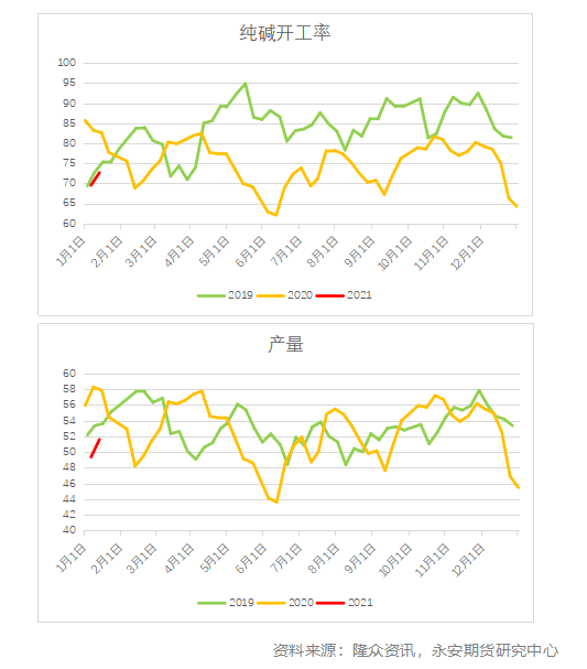 2020年纯碱整体处于供大于求的行业格局之中,纯碱价格持续下行,虽然在纯碱厂商检修和意外减产下纯碱价格在八月至十月反弹,但在碱厂复产后价格迅速回落。展望2021年,宏观格局依旧处于全球疫情复苏的向好态势之中。供应端,纯碱明年几乎没有产能的增量,整体生产节奏依旧按照检修开工计划评估,需求端在玻璃和光伏增量的基础上纯碱用量有所增加,但并没有超过纯碱的产能上限,所以纯碱依旧没有出现供不应求的格局。但需求的增量使得纯碱明年的开工率上浮2-3%依旧能维持紧平衡。