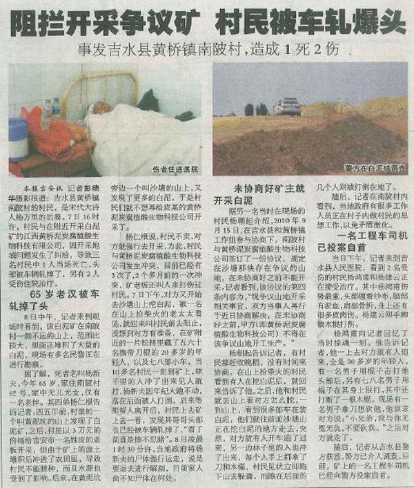 其四是,皮利伟利用自身的条件,指使其弟皮冬根、皮冬云在吉安市各县内大肆无证开采白泥矿。2010年,在吉水县黄桥镇南陂村矿山开采白泥矿时,遭到当地村民阻工,之后皮冬根带领几十名马仔赶到黄陂村,将一村民打成重伤后拖入车底伪造成车祸致该村民死亡,之后谎称是交通事故隐瞒案件真相,在当地相关人员的包庇、纵容下帮助皮冬根等人员逃避法律的打击。该事件在网络上被广泛报道。