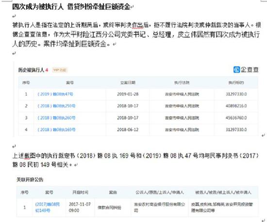 不过,保观察也注意到一篇网文《是谁撑起保护伞?江西一经理皮利伟劣迹斑斑竟逍遥法外》,称以皮利伟为首的“皮氏家族”在当地劣迹斑斑,一位叫谢才干的商人向皮利伟控制的一家投资公司借款1000万元,却被威胁生命安全并敲诈勒索近1亿元;一位从事农产品的商人李平借款150万元,却被威胁逼迫还款460万元。