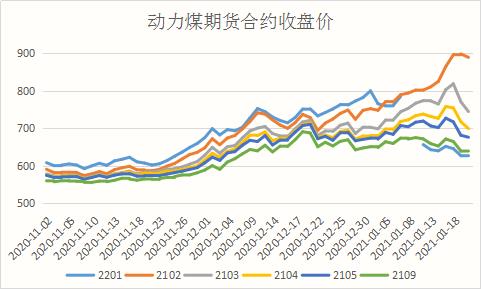 所以,禁澳煤近4个月的当下,市场逐渐适应了没有澳煤的参与,其禁入对动力煤价格的提振作用正在边际减弱。更为现实的问题是,部分煤矿在保供压力下承诺春节不放假,叠加进口额度的回归,将很好地缓解供应紧张问题,而疫情和春节临近,部分下游企业提前停工放假,需求开始降温,有利于产区港口和下游库存的累积。如此强现实、弱预期已经充分反映在盘面上。去年11月份各期货合约价差最大在50元左右,随着现货资源短缺及现货价格飙升,各合约期货价格逐渐发散。动力煤2102合约日前一度突破900元,并始终于高位震荡运行,但03、04、05合约均大幅下挫,昨日甚至封住跌停板,市场恐高情绪开始升温。